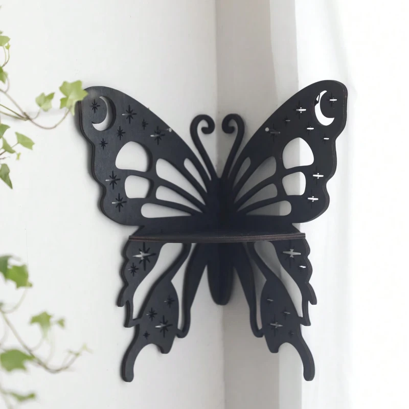 Display your prized possession with style and grace on the Butterfly Wooden Shelf! Perfectly cut to look like a beautiful butterfly, this shelf will help you show off your items with a unique and elegant flair. Get creative by mounting it on your wall and display all your crystals and other decorative items.