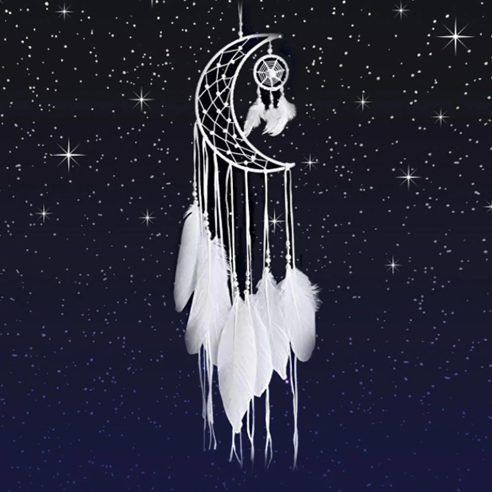Keep the nightmares with our Moon Dream Catcher. This beautiful piece of artwork will add an ambiance to your bedroom in a night time. Perfect for any aesthetic style lover!