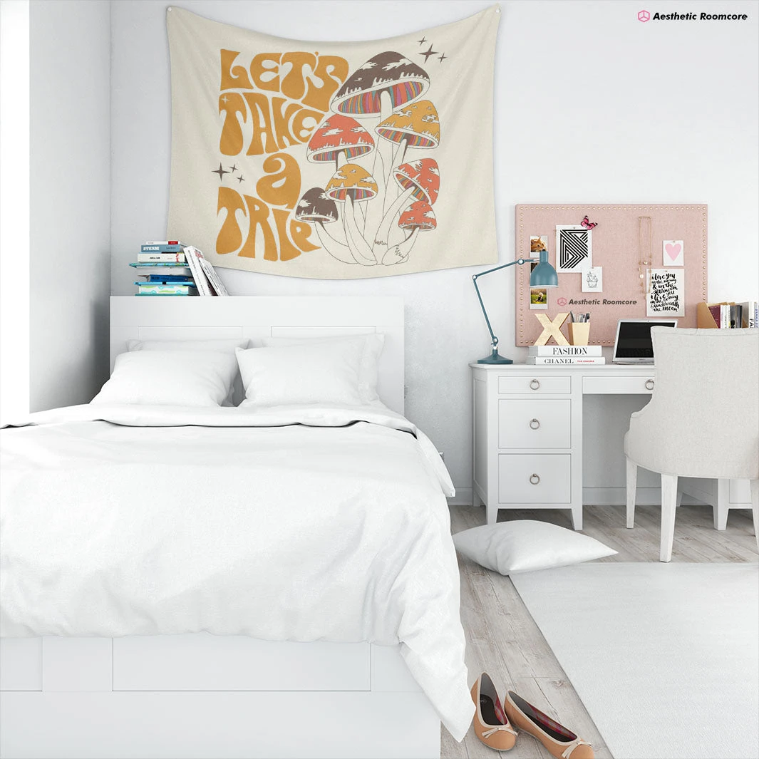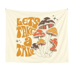Bring aesthetic look to your room with this unique Mushroom Tapestry. This beautiful piece if artwork features ‘Let’s Take A Trip’ sign with hallucinogenic mushrooms. Perfect for any aesthetic style lover!