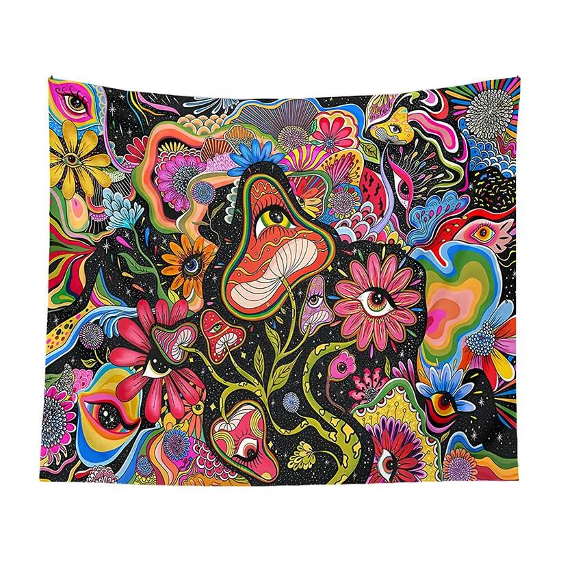 Bring trippy psychedelic vibes to your room with this unique Psychedelic Mushroom Tapestry. This beautiful piece if artwork features collection of psychedelic mushrooms and flowers in colorful vibrant colors. Perfect for any trippy aesthetic or psychedelic room decor lover!