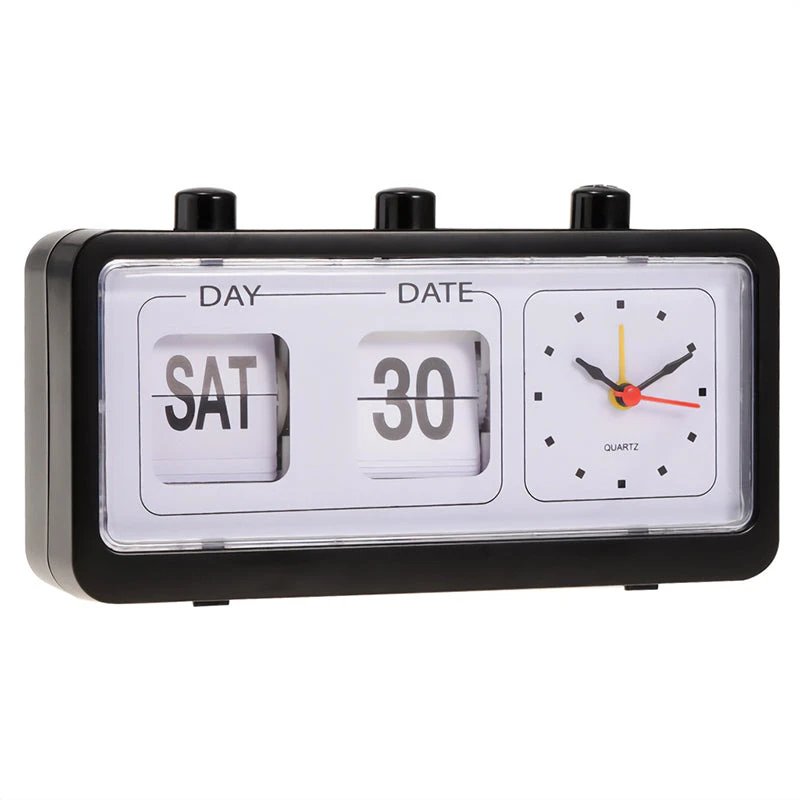 Retro Flip Clock with 3 press summary for practical use. Featuring a square analog clock on the right and a manual flip over calendar on the left. The clock has 3 summarys on top to set the clock or change the date and day. Unique design vintage aesthetic room decor, or the perfect gift for your friends.